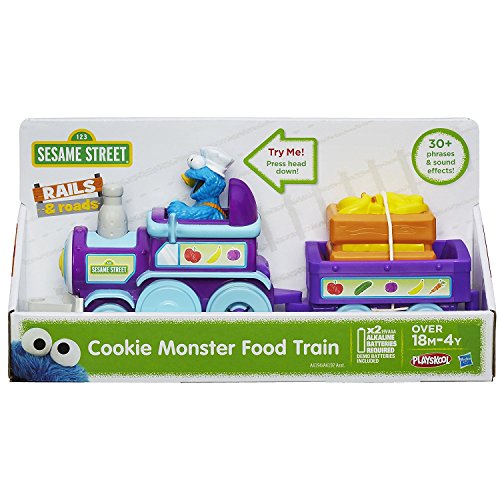 Little ones will love rolling the Cookie Monster Food Train all around the neighborhood! For fun phrases about fruits, vegetables and colors, press Cookie Monster’s head down! Playskool and all related characters are trademarks of Hasbro. Sesame Street an