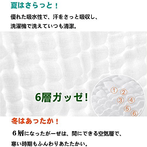 - 6重に重ねたガーゼはガーゼが空気の層を作り、温度を保つことができるため、冬でもあたたかです。通気性・速乾性が高いので汗を吸ってもすぐに乾き、蒸れません。1年中、快適にお使い頂けます。