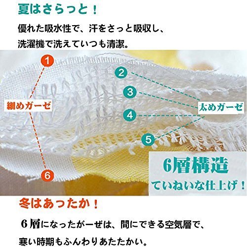- 素材:6層ガッゼコットン。良い肌触り、吸湿性、保温性に優れて夏場はしっかりと汗を吸収し、冬場は暖かさを逃さず、一年を通じて使えます。