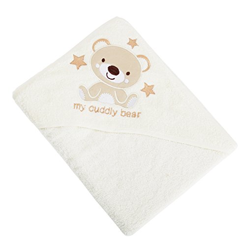 ベビー用バスタオル。サイズ:75cm x 75cm。素材:綿88%、ポリエステル12%。洗濯機洗い可。