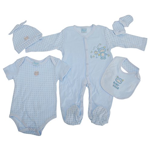 ベビーギフトセット。セット内容:スタイ、帽子、肌着、カバーオール、ミトン。ミトンの手首部分にゴム入り。スタイはマジックテープ留め。カバーオールはフロントボタン留め。綿100%。洗濯機洗い可。サイズ: 新生児、0-3ヶ月、3-6ヶ月。