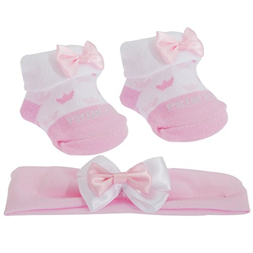 高品質ベビーアクセサリー2点セット。靴下:綿75%、ポリエステル20%、エラステーン5%。ヘアバンド:ポリエステル100%。40度以下で洗濯機洗い可。