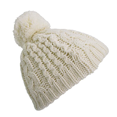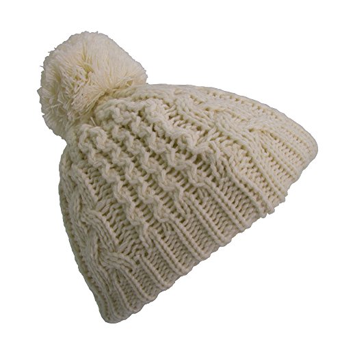 赤ちゃん用ニット帽。ケーブルニットデザイン。折り返し部分はリブ編み。ポンポンつき。全4カラー。素材:アクリル100%。手洗いのみ。