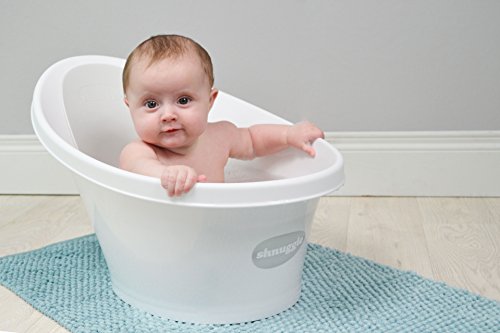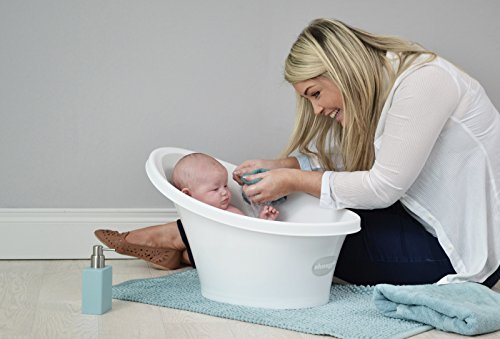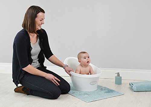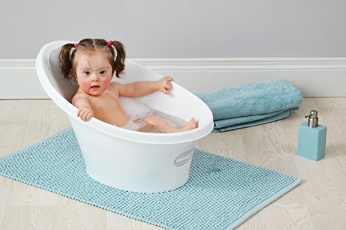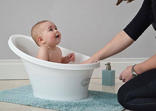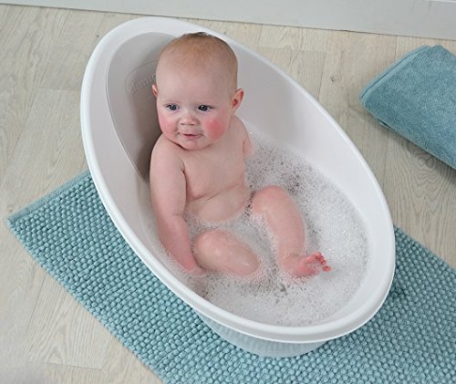 Beautiful design with smooth curves and flowing roll top;Baby bath tub is suitable from birth up to 12 months;Integrated bum bump for support and hands-free bathing;Large, warm foam backrest & grippy non-slip feet;Use in the bath, shower, kitchen sink or on the floor