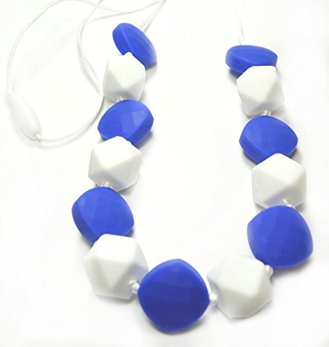 30 long Teething Necklace with a refreshing mix of blue and white chunky and flat beads;Babies love playing with these cheerful beads!;Perfect combination for work or play!;Attractive silicone jewels are made with food-grade, BPA free silicone as found in pacifiers. No PVC, latex, phthalates or metals.;Break-away clasp for safety. Great sensory tool - babies can play with beads while nursing.