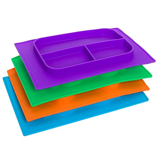 MESS-LESS MEALS - Little hands and curious minds can make a mess out of meals, but the No More Splatter Platter makes that a thing of the past. The unique design allows the tray to suction securely to hard surfaces, preventing tipping and throwing of plates and bowls. Any mess that does arise stays on the mat, so all you have to do is clean the placemat, not your table!;MAKE MEALTIME FUN - The compartments on the children's placemat are arranged into adorable, kid-friendly shapes. Combined with bright, vivid colors, your little ones will love these placemats so much they wont want to eat off of anything else!;100% FOOD GRADE SILICONE - Feel good knowing that your little one is safe when they eat. Each No More Splatter Platter is made from food grade silicone, which is BPA and PVC free, and contains no lead and phthalates.;MICROWAVE, OVEN & DISHWASHER SAFE - Making meals and the resulting clean up has never been easier! This kid's placemat is safe to heat in the oven or microwave, and washes up perfectly in the dishwasher, so you can spend more time with your family, and less on chores.;PRODUCT SPECIFICATIONS - Each placemat measures 10 x 15 x 1. Compartment sizes: Butterfly - two 8oz and two 5 oz; Bento box - one 16oz and two 8 oz; Car - two 4oz and two 8oz; Frog - one 16oz and two 6oz.