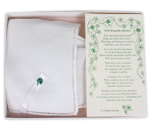 White Linen Irish Keepsake Bonnet with Embroidered Shamrock in Gift Box by Simply Charming