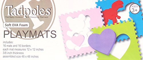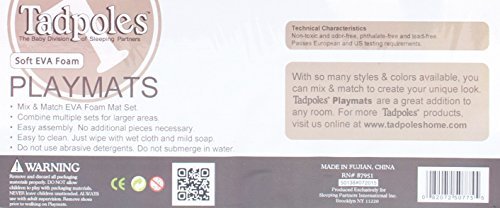 Using soft playful foam, Tadpoles ABC Floor Mats provide a fun, safe environment for your little one. Made of large interlocking foam puzzle pieces with removable letters and numbers, the mats create a soft base for the baby, and a great look for the room. Includes 36 Foam pieces with removable letters and numbers and 24 border pieces. Covers 36 square feet.