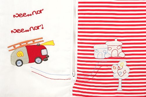 Premium quality sleep sack wearable blanket made from 100% cotton - ensuring your child has a peaceful and safe night's sleep;Beautiful baby sleep sack for boys made from white/red striped cotton with fire engine embroidery, great alternative to blue;Baby sleeping bag standard weight approx. 2.5 Tog for all year round use and room temperatures between 59-70 F?;Size S: 0-6 months - suitable from 9 - 18 lbs/22 - 27 in, generous sizing for maximum value for money;Outer/Lining: 100% cotton, Padding: 100% soft polyester fleece, easy care - machine wash at 100 F? and low heat tumble dry