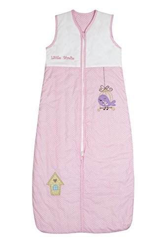 Beautiful baby sleeping bag made with 100% cotton, pink with white polka dots and bird embroidery;Light weight sleeping bag approx. 0.5 tog - unpadded, for hot weather and room temperatures above 24 degrees;Slumbersac sleep sacks keep your child safe and at a constant temperature throughout the night;Size: 110 cm, suitable from 12 months to 2 years (folded) and to 3 years when extended, middle zip with protective zip cover;Easy care - machine wash at 40 degrees and low heat tumble dry