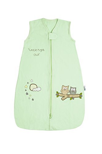 A beautiful baby sleeping bag made with soft 100% jersey cotton and lined with 100% soft cotton. Mint green with owl embroidery.;Approximately 0.5 tog for those hot summer nights; also ideal for daytime naps, suitable for roomm temperatures above 24 degrees.;This Slumbersac sleeping bag comes in four sizes: Size 0/Newborn 56cm (birth weight below 4kg), Size 1/70 cm: birth (4kg/8 lbs) up to 6 months, Size 2/90 cm: 6 up to 18 months and Size 3/110 cm: 12 months up to two years when folded and three years when extended.;All sizes come with a centre zip complete with a zip cover. The centre zip fastens from the bottom to prevent any escapes.;Machine wash at 40 degrees and low heat tumble dry.