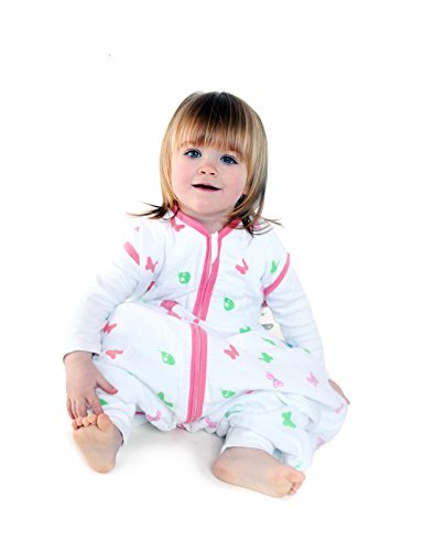 Muslin Baby Sleeping bag with feet - Light weight approx. 0.5 tog for those hot summers, ideal for room temperatures above 24 degrees. Muslin cotton with all over butterfly print.;Toddlers can crawl and walk around safely in this sleeping bag when awake and feet can be put inside the sleeping bag during sleep time.;Slumbersac baby sleeping bags with feet come in four sizes: Size 1: 12-18 months/80cm Size 2: 18-24 months/90cm Size 3: 24-36 months/100cmSize 4: 3-4 years/110cm, all sizes have a front centre zip opening from top to bottom;Material: 2 Layers of 100% Muslin Cotton;Machine wash at 40 degrees and low heat tumble dry.