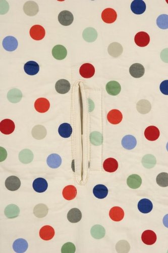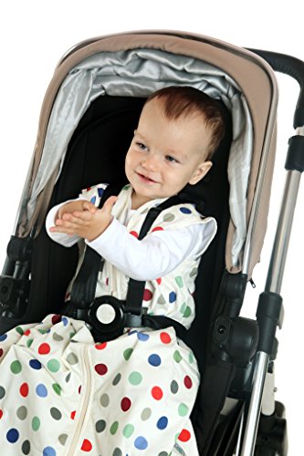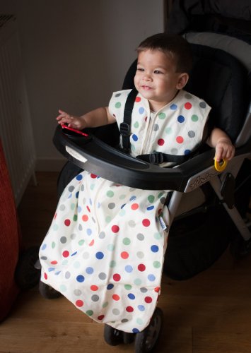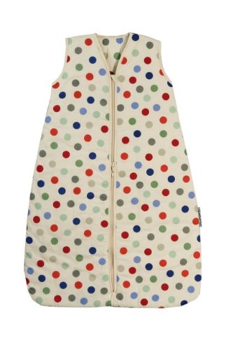 Standard baby travel sleeping bag approx. 2.5 Tog made with cream colored 100% cotton printed with bold dots. Suitable for all year round use and room temperatures 59 to 70?F.;The ideal solution for families on the move; the back vent allows the car seat or buggy harness to be popped through the baby sleeping bag, between the two way zip. Fasten the harness in the usual way. The two way, front zip, allows simple adjustment for baby's comfort. On arrival home baby can be transferred without effort from car seat to cot.;Outer and Lining: 100% Cotton with print, Padding: soft polyester fleece to prevent migration and allergies. Machine wash at 100?F and low heat tumble dry.;This Schlummersack winter travel sleeping bag comes in three sizes: