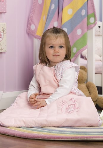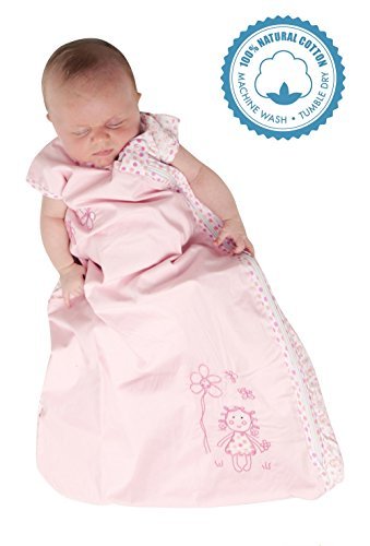 Standard baby sleeping bag approx. 2.5 Tog made with pink printed 100% cotton sheeting featuring an adorable doll embroidery. Suitable for all year round use and room temperatures 59 to 70?F.;This Schlummersack sleeping bag comes in three sizes: