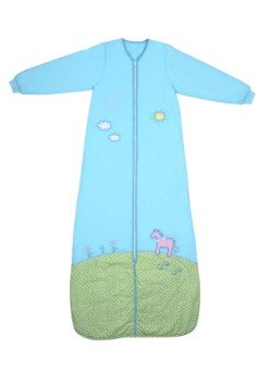 Girls winter sleeping bag with long sleeves approx. 3.5 Tog made with turquoise/green 100% cotton sheeting featuring pony themed embroidery. Suitable for winter use, camping and room temperatures below 59 ?F .;This Schlummersack sleeping bag comes in three sizes: