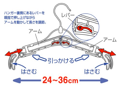 アームが5段階(24cm,27cm,30cm,33cm,36cm)に伸び縮みするので洋服のサイズが大きくなってもジャストフィットします。