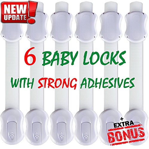 - ✔EASY TO INSTALL AND HANDLE: You can childproof your house in less than 5 minutes! Simply cut strap to desired length and stick the baby locks to any surface using the very strong long lasting, non-marking adhesives. Simple to install and extremely easy for you to open with one hand but difficult for your little ones to figure out.