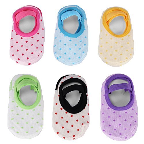 Adorable and cute socks, High quality within good elastic.;Suitable for 8-36 months baby, it may be a little big.;Anti-slip skid socks and the grips on the bottoms of the booties make it easier for your baby to move around the hardwood floors.;The pack comes with 6 individually wrapped pink, purple, green, yellow, blue , black and red socks. The socks have a cute little strap to help keep the socks on. The strap is a comfortable fit too. Tight enough to keep them on.;The socks are decently thick and roomy - will fit a variety of age ranges easily. Even if your child's feet are small you will get a lot of use out of these because they have room to grow into them. The socks also have a nice amount of stretch to them and are really easy to slide on. The strap across the top keeps them in place but is not tight against the foot so its comfy for them to wear.