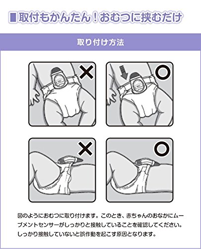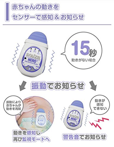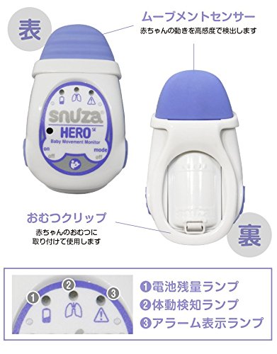 赤ちゃんが眠っている間に腹部の動きをモニタリングします。 煩わしいコード、ワイヤー、センサパッドや外部電源などは不要です。 使い方は電源を入れ、固定クリップでおむつに取付けるだけで簡単にご使用いただけます。 音量調整は「MODE/OFF」ボタンで行います。 (使用方法) 1.起動 前面の左側にある「ON/OFF」ホ?タンを押して起動します。各ライトが数回点滅して、ハ?イフ?レーションと音がなります。 赤ちゃんのおむつにクリップで挟む様に取付けます。この時、赤ちゃんのおなかにムーブメントセンサーがしっかりと接触していることを確認してください。 2.電源 OFF 左側の「ON/OFF」ボタンと右側の「MODE/OFF」ホ?タンを同時に押します。 サイズ:約7x2.5x4.5cm 重量:約31g 電源:リチウム電池(3V、CR2(CR15270)型×1個使用) 定格電源電圧:DC3V 消費電圧:3v 性別:男女共用 医療機器の種類:一般医療機器 付属品:本体、本体ケース、日本語取扱説明書、動作確認用電池(動作確認用の為、通常の物より寿命が短い場合もあります) ・本製品は乳幼児突然死症候群(SIDS)の予防や睡眠障害(睡眠時無呼吸等)の病気の評価に用いる機器ではありません。 ・乳児の状態は本製品による体動の情報だけで判断せず、必ず保護者や看護者が確認してください。 ・スヌーザヒーローは、外部の動きを拾うため、添い寝やベッドの共有には適していません。車のシートやベビーカーなど、赤ちゃんが動いているときの使用はおすすめしません。