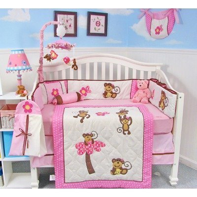 SoHo Pink Monkey Party Baby Crib Nursery Bedding Set 13 pcs included Diaper Bag with Changing Pad & Bottle Case