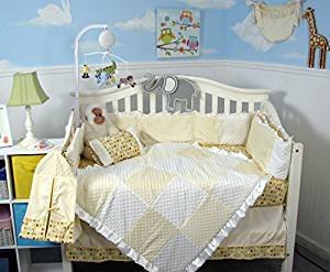 11 Piece Set Includes:(1)Crib Quilt ,(1)4 sided Crib Liner;(1)Fitted Sheet,(1)Crib Skirt (Dust Ruffle),(1)Diaper Stacker;(2)of Window Valances ,(1)Toy Bag ,(1)Baby Pillow;(1)Baby Bib, (1) Neck Pillow;This set fits all Baby cribs and Toddler Bed!