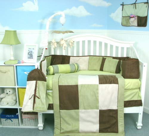 Soho Sage & Brown Suede Baby Crib Nursery Bedding Set 13 pcs included Diaper Bag with Changing Pad & Bottle Case