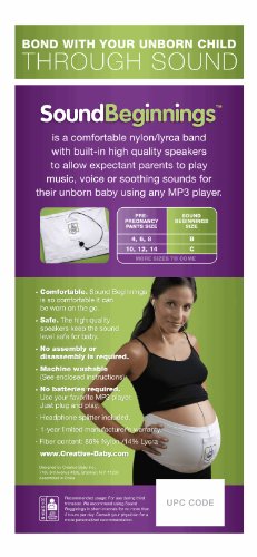 Sound Beginnings is a stretchy soft fabric band, there are no clips, Velcro or glue to keep speakers in place;The high quality speakers are designed to keep total sound output to a level that is safe for baby;No assembly or disassembly required; Sound Beginnings is completely machine washable;Just plug into any MP3 player/iPod and play, headphone splitter included allowing mom or dad to listen with baby;Sound Beginnings' quality double ply band will provide the support moms needs as she grows