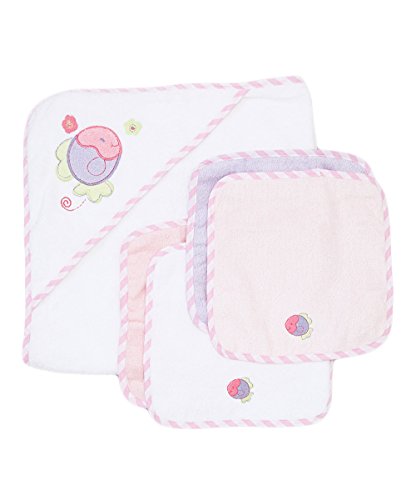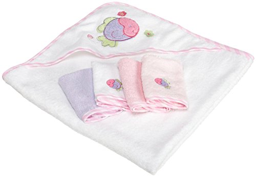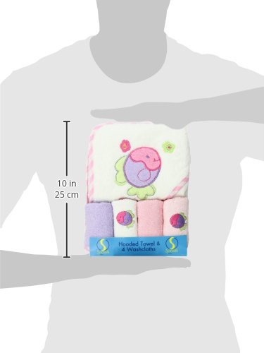 100% cotton terry thick, soft and absorbent;Hooded to keep baby warm;Perfect for drying and wrapping baby after bath;Coordinated applique Hooded Towel with 4 washcloths;Perfect for shower gift