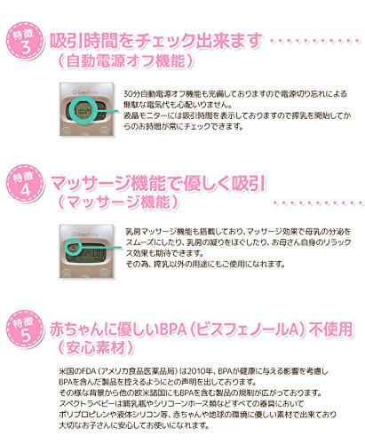 - 本体の液晶ディスプレイには搾乳時間が表示され、30分自動電源OFF機能も完備しています。搾乳以外にもマッサージ機能も付属しており授乳時以外の時間にご利用頂ける搾乳機です。
