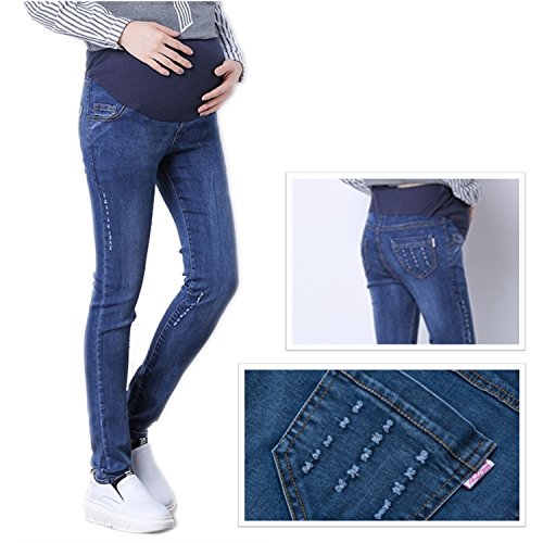 Spinas(スピナス) マタニティ デニム 妊娠中でもオシャレを楽しみたい! パンツ スキニ― ジーンズ ステッチ デザイン ヴィンテージ ウエストゴム 調節可 (ブルー)