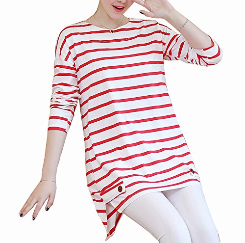 Spinas (スピナス) マタニティ レディース 裾のボタンが アクセント ボーダー カットソー チュニック ロンT長袖 全2色 (レッド/ネイビー)
