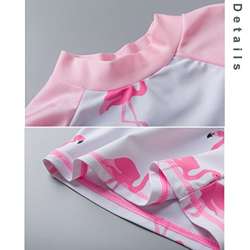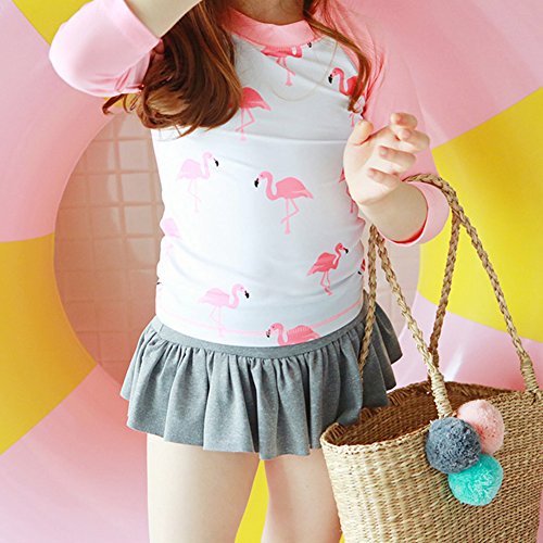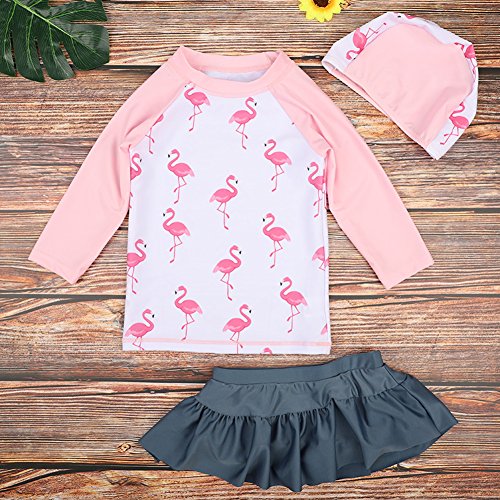 Spinas(スピナス)ベビー キッズ ツーピース 水着 可愛い フラミンゴ柄 7分袖 トップス スカート付きパンツ スイミングキャップもセット 80-140cm
