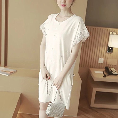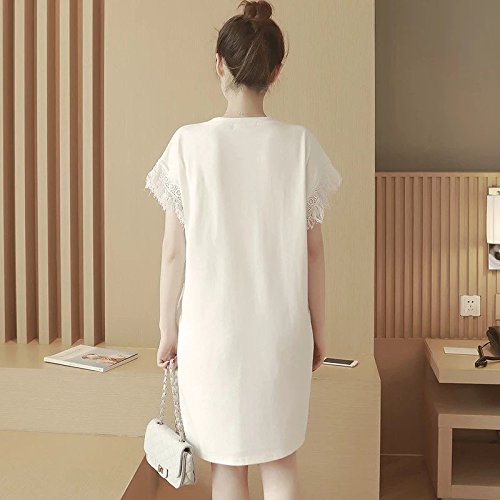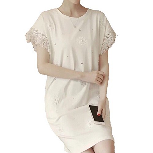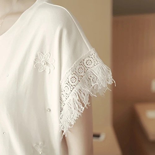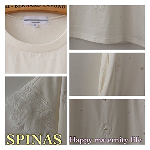 Spinas(スピナス) レディース マタニティ ウェア ワンピース フリンジ 花 刺繍 フラワー ひざ丈 丸首 シンプル 大人 かわいい 夏 楽 ふんわり Tシャツ (L)