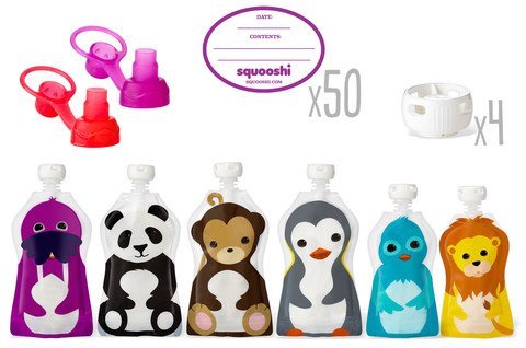 EASIEST POUCH TO USE COOLEST DESIGNS PERFECT SIZE TO HOLD MY KIDS WILL EAT ANYTHING OUT OF A SQUOOSHI as reviewed by parents around the world! Join the Squooshi Family! Our straight forward shape with a top spout and wide bottom zipper allow you to easily fill your Squooshi pouches with your favorite squishy food by using a regular spoon or pour directly into the pouch. Seal & Go!;EASY TO USE - Our straight forward shape with a top spout and wide bottom zipper allow you to easily fill your Squooshi pouches with your favorite squishy food by using a regular spoon or pour directly into the pouch from your blender of choice. Fill. Eat. Wash. Repeat. It's that easy!;EASY TO CLEAN - Wash by hand with warm soapy water and a bottle brush or place in the top rack of your dishwasher. Bottom zipper & rounded shape allows for a complete rinse of water to stream through pouch. Bottom zipper allows for pouch to be fully opened to air dry. No corners or cracks for food to get stuck.;BETTER FOR THE PLANET - Squooshi resealable food pouches use less fuel in shipping than do pre-packaged food-filled pouches, and they are MADE WITH FAMILY IN MIND - Made to last with durable, BPA, Phthlate, PVC & Lead Free materials with a no choke cap.;Two choomee Sip'n Soft tops and 4 replacement no choke Safety Caps Included (Color Varies)