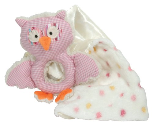 Stephan Baby pink and white gingham Shabby Owl rattle and polka dot Fleece Blankie gift set;7 Shabby Owl rattle features a crisp fabric front and shaggy sherpa back to create a pleasing tactile experience for baby, machine wash cold, tumble dry low, remove promptly;Ultra cushy, satin lined polka dot coral fleece blankie measures a go everywhere 12 x 12, 100% polyester, machine wash cold on gentle cycle, tumble dry low, remove promptly;Gift set arrives presented in a lovely sheer fabric gift sack tied with a satin bow;Since 1987, Stephan Baby has been creating unique and heartwarming gifts for little ones