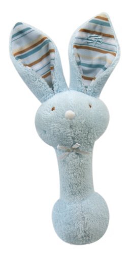 Stephan Baby blue Fuzzy Bunnie rattle with fabric-lined ears;8 Bunnie rattle features a super-soft and durable velboa plush body with embroidered eyes and a securely-sewn pompom nose;Plush body combined with fabric-lined ears provide baby with fun tactile experiences; Rattle post is sized for even the smallest hands;100% polyester; machine wash cold on gentle cycle; tumble dry low or air dry; do not bleach;Since 1987, Stephan Baby has been creating unique and heartwarming gifts for little ones