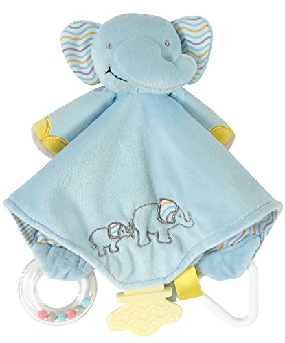 Blue elephant Chewbie activity toy security blanket features a teething toy, ring rattle, triangle and satin knot; security blanket portion measures 10 x 10;Sweetly smiling elephant has all-embroidered facial features, embroidered accents and 100% bisphenol-free plastic attachments to ensure baby's safety;Soft 100% polyester plush security blanket is lined with 100% cotton knit;Machine wash cold on gentle cycle or hand wash; air dry; do not bleach;Since 1987, Stephan Baby has been creating unique and heartwarming gifts for little ones