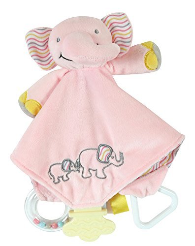 Pink elephant Chewbie activity toy security blanket features a teething toy, ring rattle, triangle and satin knot; security blanket portion measures 10" x 10"