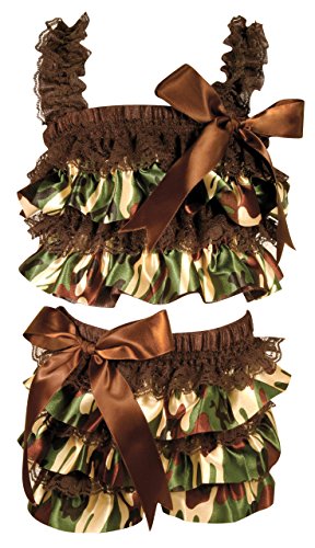 Stephan Baby's camo print ruffled flapper top and diaper cover is simply a festival of ruffles and makes the perfect ensemble for special occasions;Sassy lace and camo print ruffled top has elastic for a nice fit and chocolate brown satin lined ruffled lace straps accented by a chocolate brown satin bow;Adorable pants feature layers of alternating chocolate brown lace and camo print ruffles, have a covered elastic waist for comfort and a chocolate brown satin bow at the waist