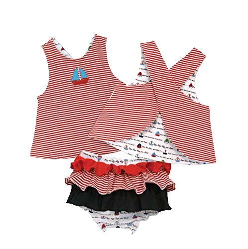 6-12 month size Row Your Boat reversible top and ruffled diaper cover is perfect for summer, a day at the beach or a play date at the park;Top is red and white stripes with an embroidered sailboat on one side and sailboat print on the reverse; sailboat print diaper cover is generously ruffled in stripes and solids on the back;Soft and breathable 100% cotton construction; machine wash cold and tumble dry low; do not bleach;Look for the coordinating Row Your Boat bowling shirt and diaper cover set for boys; together they make adorable sister and brother outfits; each purchased separately;Since 1987, Stephan Baby has been creating unique and heartwarming gifts for little ones