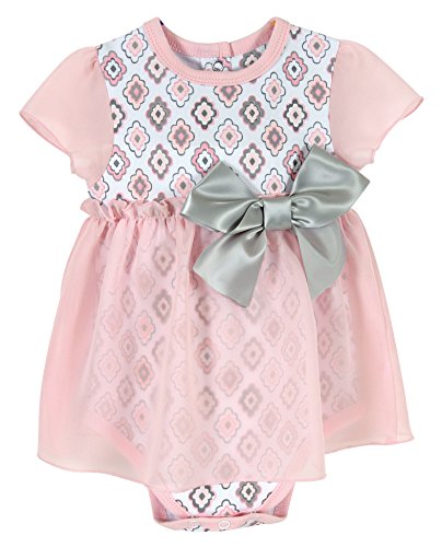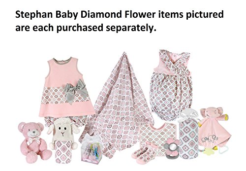 0-3 month size Diamond Flower snap dress-style diaper cover takes your little one from diapered to dressed up in a single step; it's ideal for so many special occasions;Soft and comfortable pink, grey and white knit snap shirt body features fluttery chiffon sleeves and a chiffon skirt;A feminine satin bow at the waist adds the perfect finishing touch; neck and leg openings are bound in soft pink cotton bias;Snap shirt-style diaper cover body is 100% cotton with 100% polyester chiffon; machine wash cold on delicate cycle and tumble dry low; remove promptly; do not bleach;Since 1987, Stephan Baby has been creating unique and heartwarming gifts for little ones