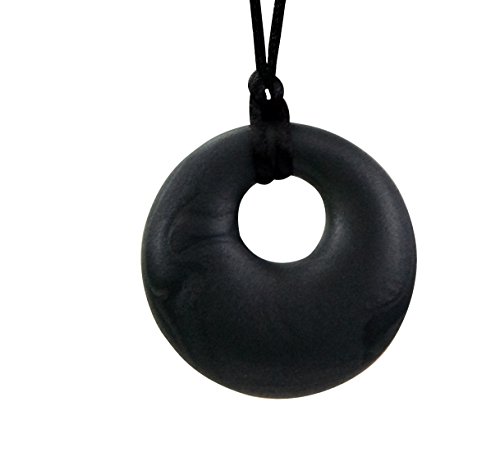 Made of tasteless, odorless silicone that is ideal for chewing. Nontoxic, FDA-compliant food-grade silicone. BPA, PVC, lead, heavy metal, latex, and phthalate free.;Suitable for Autism, SPD, sensory seeking, oral motor needs, or teething);Silicone is easy to clean (dishwasher safe) and naturally resists the growth of bacteria.;Made of tasteless, odorless material that is ideal for chewing. 2 diameter, .25 to .5 thick;30-inch black cord with brushed satin finish and breakaway clasp, can easily be shortened to your preferred length.