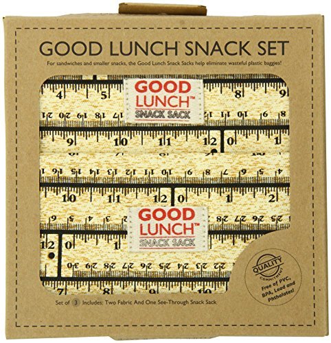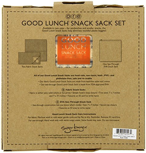 Reusable Snack Sack Sets feature Sugarboogers Ruler pattern to make for a low impact lunch. Fabric Good Lunch Snack Sacks are made from lead free nylon and cotton. See through Good Lunch Snack Sack is made from FDA approved EVA. Set of 3. Large fabric sack measures 7 by 7" , small fabric sack measures 7 by 3.75" and EVA sack measures 7 by 7" . Nylon and cotton sacks are machine wash using delicate cycle and line dry. EVA sack is hand wash only with soapy water.