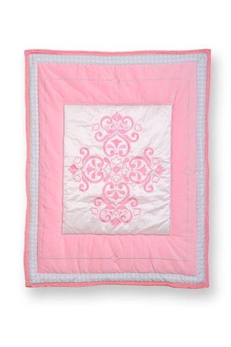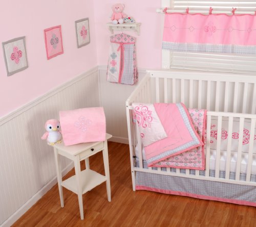The sumersault 4 piece set include comforter, 2 crib sheets and a dust ruffle;Rich and luxurious fabrics are used with magnificent embroidery throughout the set;Shades of warm baby pink, pale pink and soft grey create an elegant and sumptuous collection