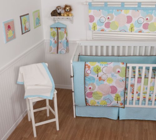 4 piece crib set includes comforter, 2 crib sheets and dust ruffle;2 crib sheets 1 in main print and the other in coordinating print;Soft color pallet