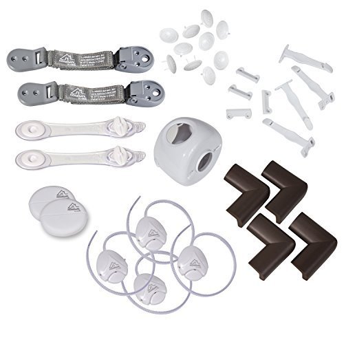 Contains 29 essential safety items, 2 Multi Use Latches, 4 Handle & Knob Soft Slide Locks, 2 Blind Cord Shorteners, 10 Outlet Protectors, 4 Foam Corner Cushions, 2 Furniture Secure Straps (and screws), 1 Door Knob Safety Kit, 4 Cabinet & Drawer Latches (and screws), Easy installation and removal