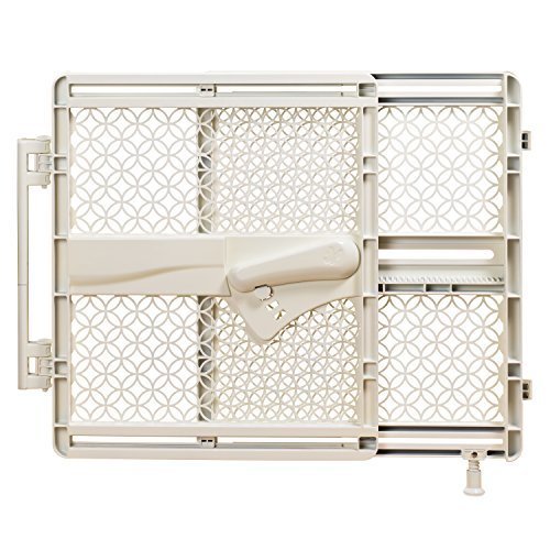 Pressure mount installation for use between rooms and hardware mount for use at top of stairs with included hardware; Adhesive pressure mount installation, provides a swing gate for use in doorways, Fits openings 27" - 41" wide without hinge and 26"-42" wide with hinge, 28" tall, Smart strip install provides a secure hold, with no drilling required, Stainless steel hardware for outdoor use with foot for added support, Stylish gate panel blends with home decor
