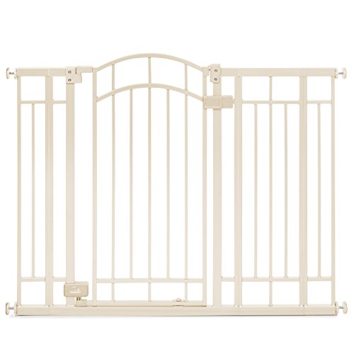Pressure mounted installation for use between rooms, Optional hardware mounts included for installation on stairways, 36" tall gate fits openings 28-48" wide, Dual locking, auto-close walk through door, Beige metal finish
