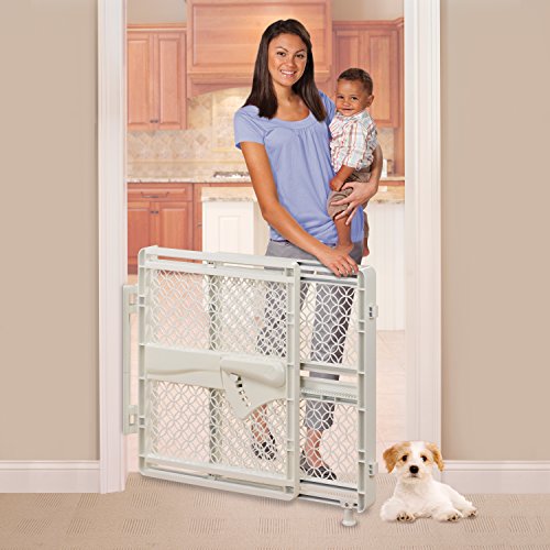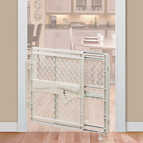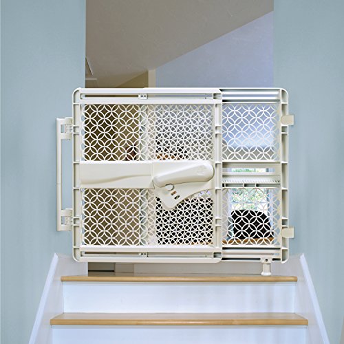 Pressure mount installation for use between rooms and hardware mount for use at top of stairs with included hardware; Adhesive pressure mount installation, provides a swing gate for use in doorways, Fits openings 27" - 41" wide without hinge and 26"-42" wide with hinge, 28" tall, Smart strip install provides a secure hold, with no drilling required, Stainless steel hardware for outdoor use with foot for added support, Stylish gate panel blends with home decor