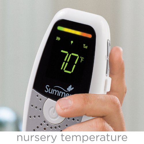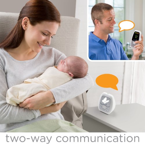 Advanced Technology: 1) 100% digital technology ensures an interference-free, private and secure connection, with up to 650' range, 2) Sound activated LED lights, indicating the level of noise coming from baby's room, Remote Control: 1) Monitor temperature in baby's room, reading on parent unit with option for Fahrenheit or Celsius reading, 2) Nightlight with remote on/off, 3) Two-way communication, Portability and Convenience: 1) Handheld portability with built-in belt clip, 2) Adjustable volume control, and out of range and low battery alerts, 3) High-sensitivity microphone focuses on baby's sounds, while filtering background, ambient noises, Includes rechargeable battery, Warranty: 1 year